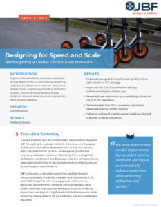 A global mobility and micro-fulfillment organization engaged JBF Consulting to evaluate its North American and European distribution network to determine how to improve service, right-size distribution facilities, and support growth and inventory reduction initiatives. Operating from a single U.S. distribution center and one European hub, the company faced extended transit times to key markets and uncertainty around future footprint requirements.